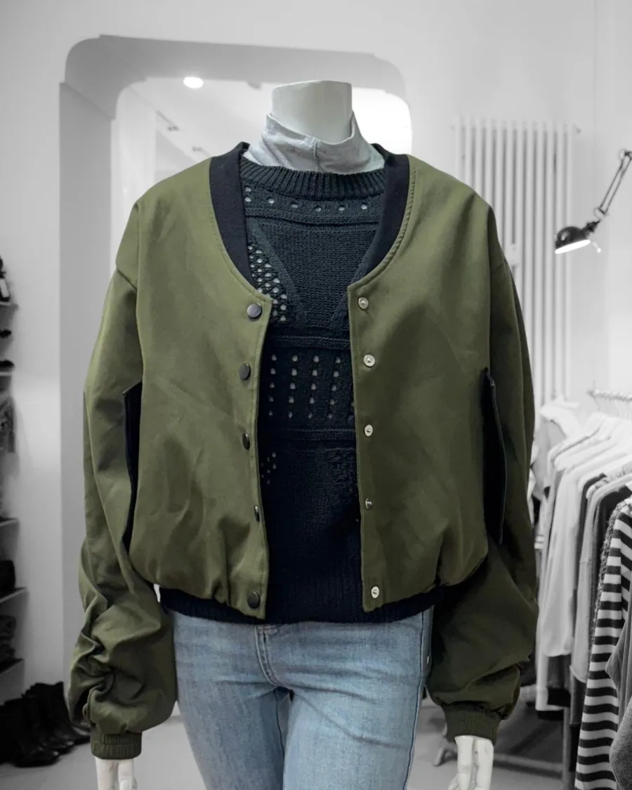 軍綠抓皺皮革拼接飛行夾克